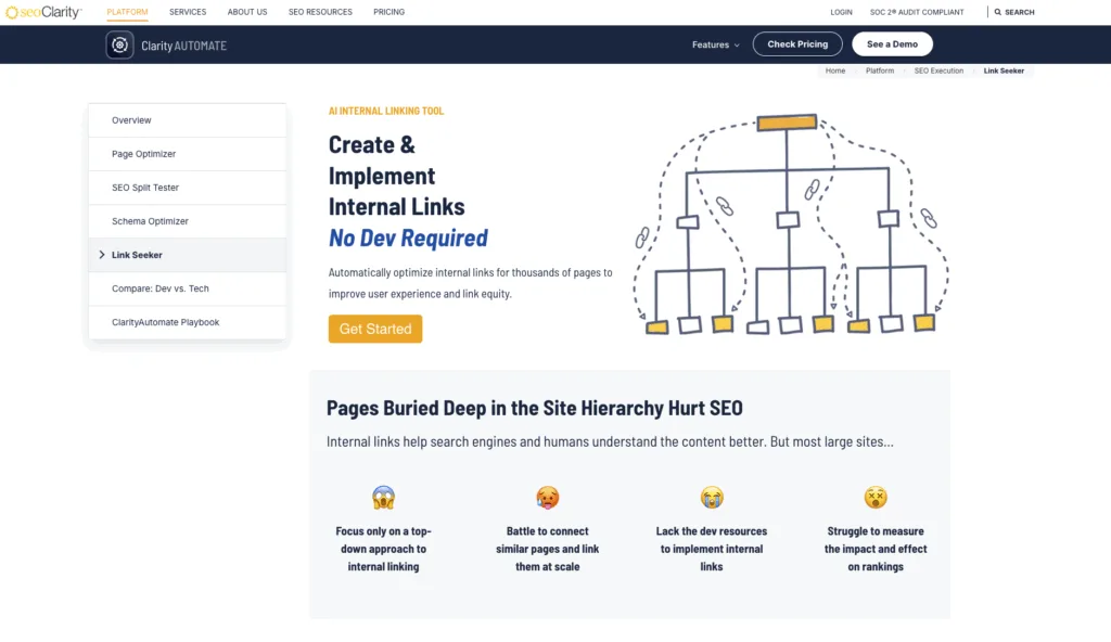 seoClarity’s Link Seeker is an AI-powered internal linking tool built for large websites that need to scale internal linking without heavily reliance on development resources.